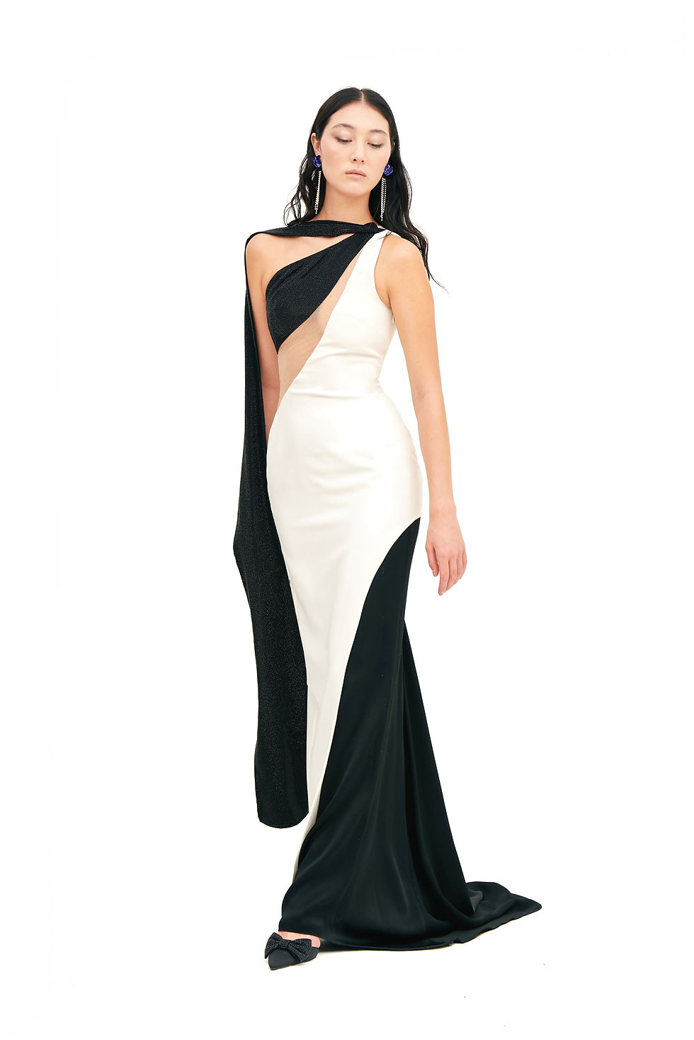 CONTRAST GOWN WITH DRAPED NECKLINE AND TRAIN