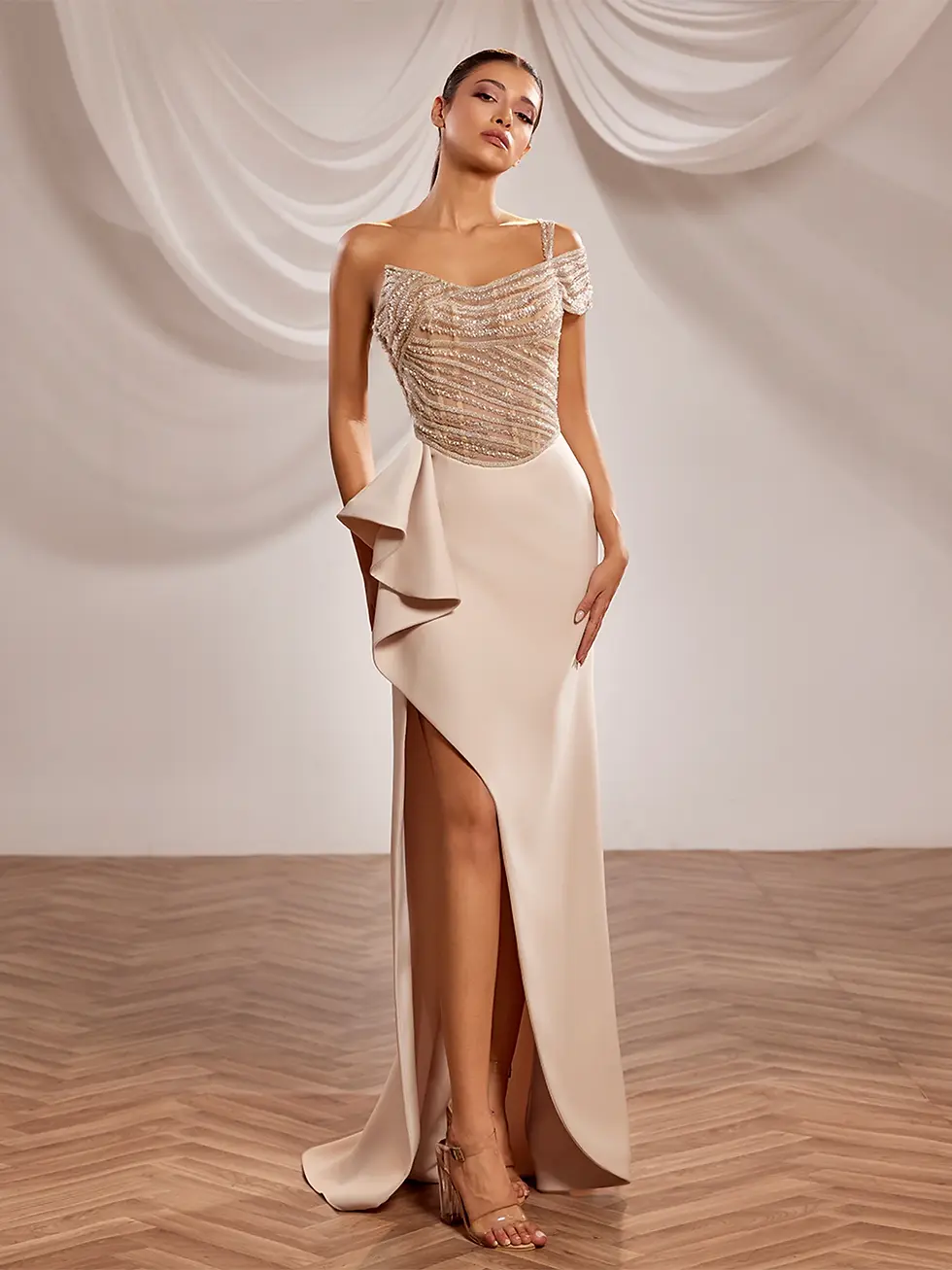 SS235- Blush off-shoulder gown with beaded bodice